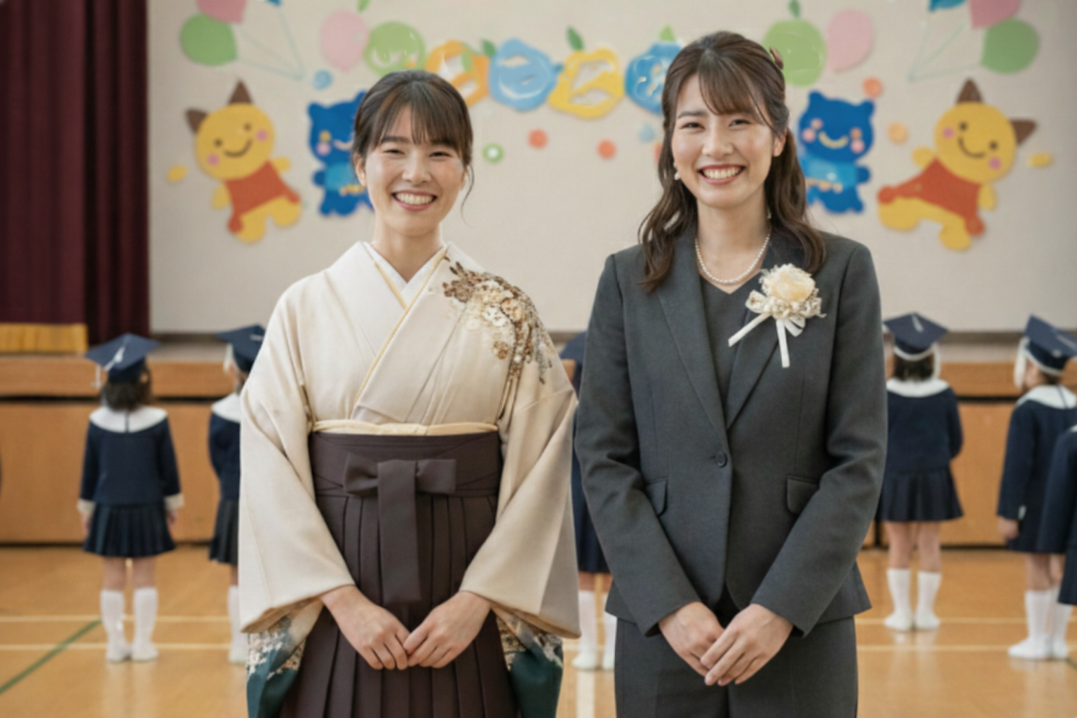卒園式での保育士の服装は、ネイビーや黒などのスーツや袴が基本です。門出とお別れの式典にふさわしく、主役の子どもたちを引き立てながら、お祝いの思いも込めた先生らしいファッションにしたいですね。担任なら袴、それ以外の先生はスーツといった役割別の選び方から、ストッキングや靴、髪型、メイクのマナーに加え、卒園式の服装でモヤモヤしている疑問についてもQ&Aで解説します。