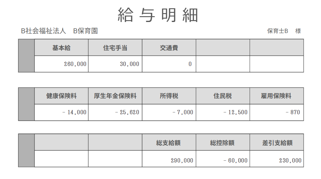 手当を含めて29万円と高収入なBさんですが、この場合は、手当も含めた額から税金や社会保険料が算出されてしまうため、Aさんに比べて控除額が上がってしまうのが特徴です。