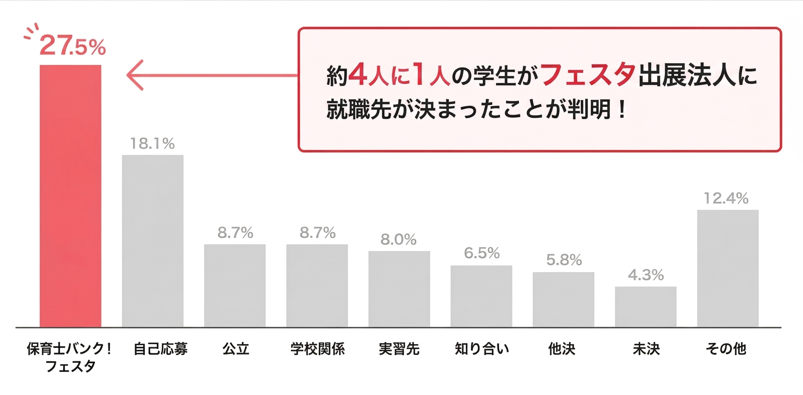 独自に行った調査の結果、保育士バンク!就職・転職フェアに参加した学生の約3割がフェア出展法人に就職を決めていることがわかりました。