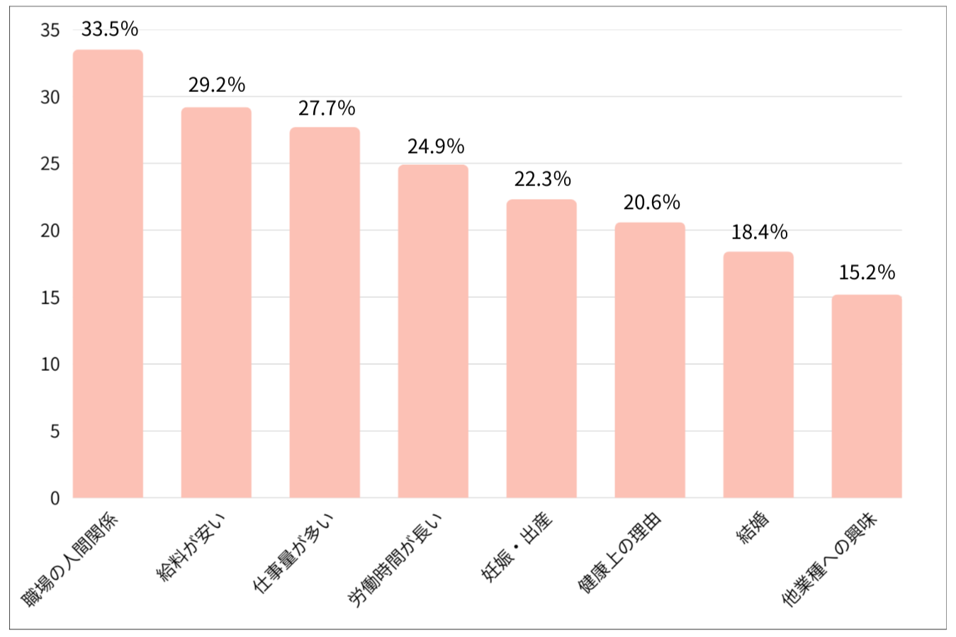 これは、保育士として働いていたものの、実際の職場が肌に合わないと感じる、ライフステージの変化による働き方の希望に合わなくなったなどの理由で、現場を離れる保育士が多いことが分かります。