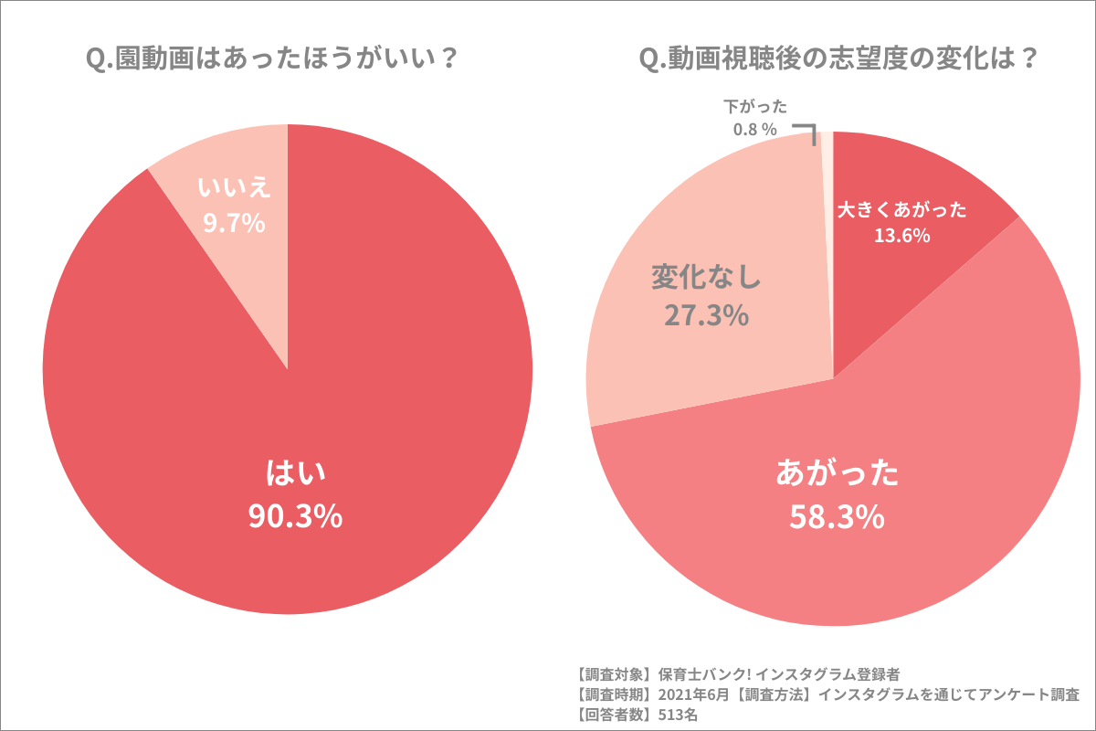 当社ネクストビートが実施したアンケートによると、約9割が「園の動画はあったほうがいい」と回答しており、動画を視聴することで志望度が上がったというデータもあります。
