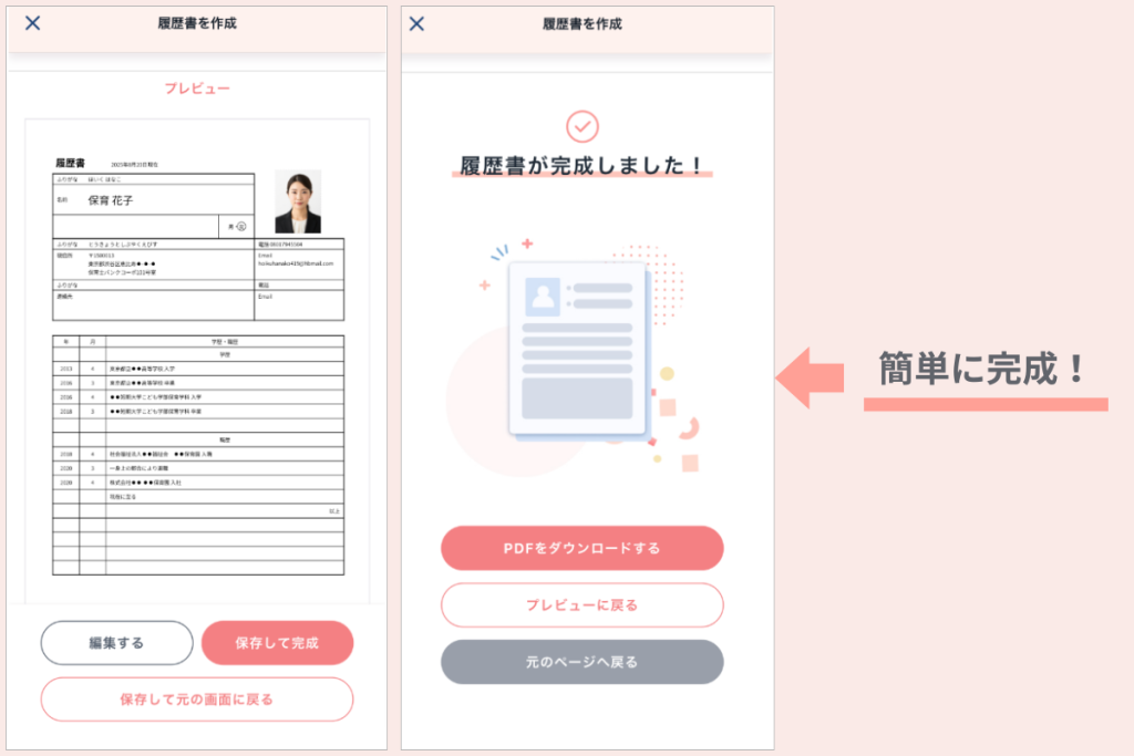 完成後はスマホにダウンロードすれば自動的にPDF形式で保存されるので、メールでの応募やプリントの際にも便利でしょう。