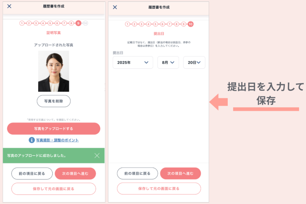 写真をアップ後、次の画面で提出日を選択すれば履歴書の完成です!