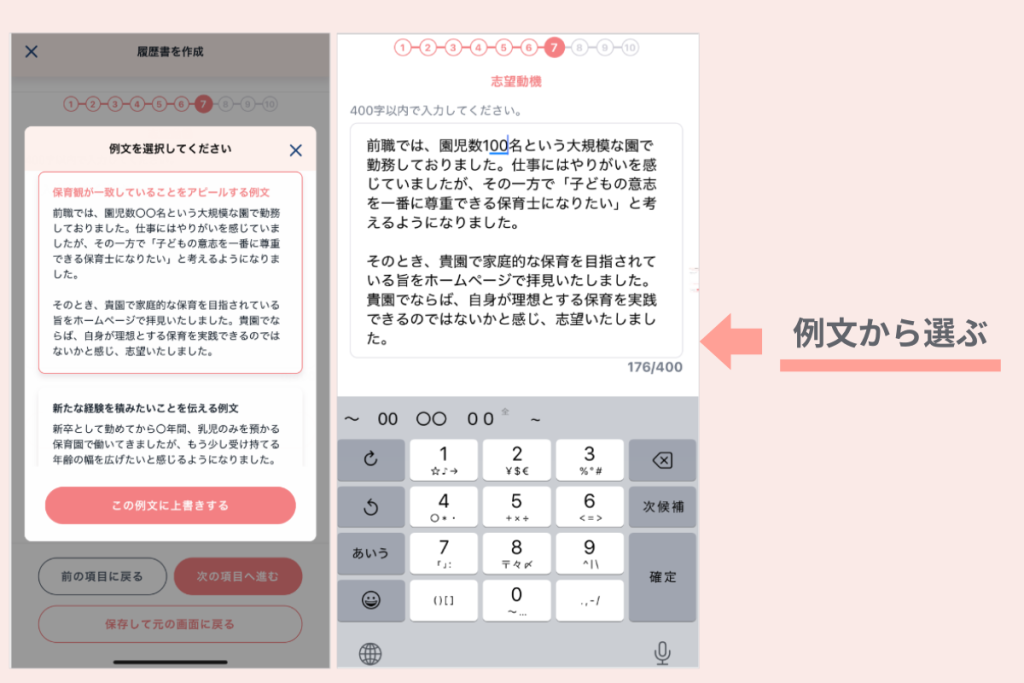志望動機は、豊富な例文から自分にあったものを選んでワンタップで入れることができます。例文を選んだら、フォーム内でオリジナルの内容に編集するだけなので、時短で作成できそうですね。