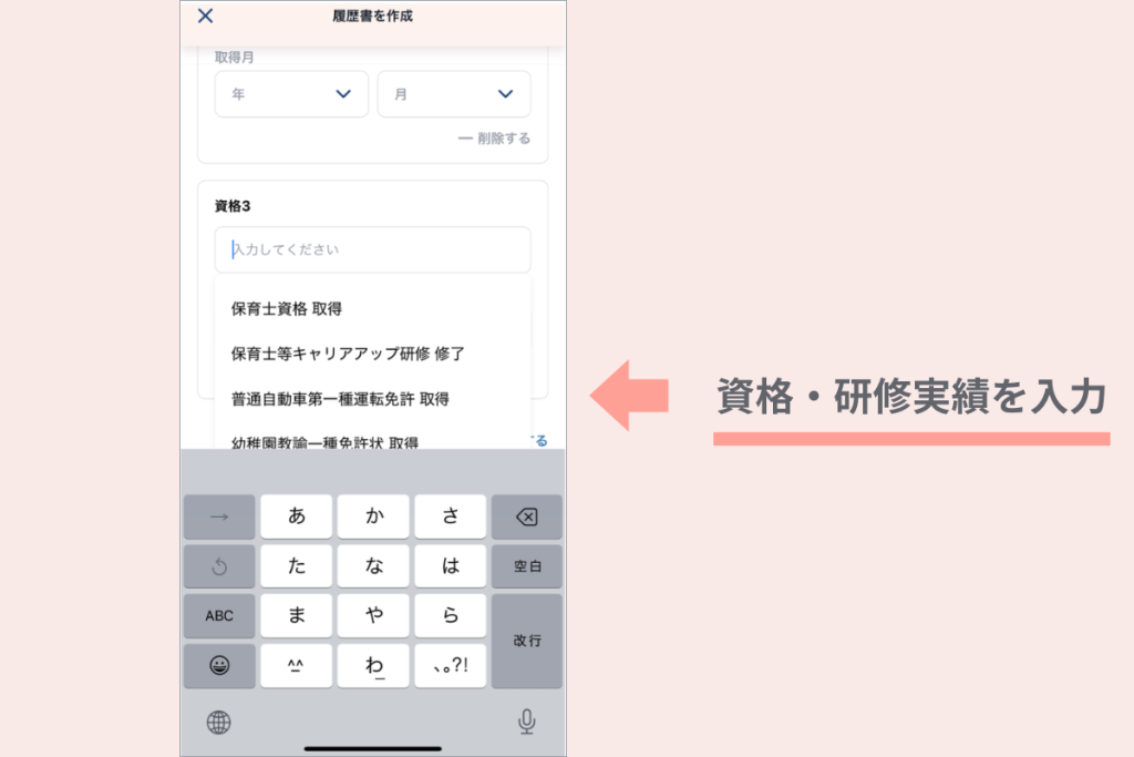 この作成ツールでは資格名がスクロールで選択できるので、書き方に迷うことなく入力できます。
