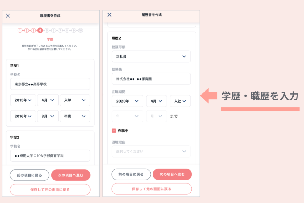 職歴では、保育士さんならではの「入社・入職」が選択でき、退職理由も豊富な選択肢から探すことができます。退職前であれば、入社年月の下の「在職中」にチェックを入れましょう。