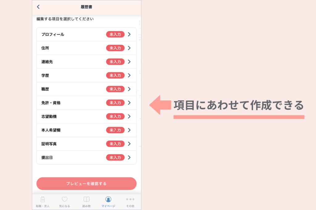 保存前に履歴書フォーマットの形式でプレビューができるので、直したい項目に戻って修正したり追加したりといった作業も自由自在にできます。